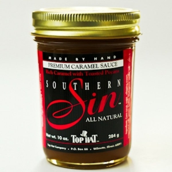 Southern Sin combines our rich, thick cream caramel with crunchy pecans - like pecan pie in a jar. Chewy on ice cream, delicious on brownies - great just on a spoon.