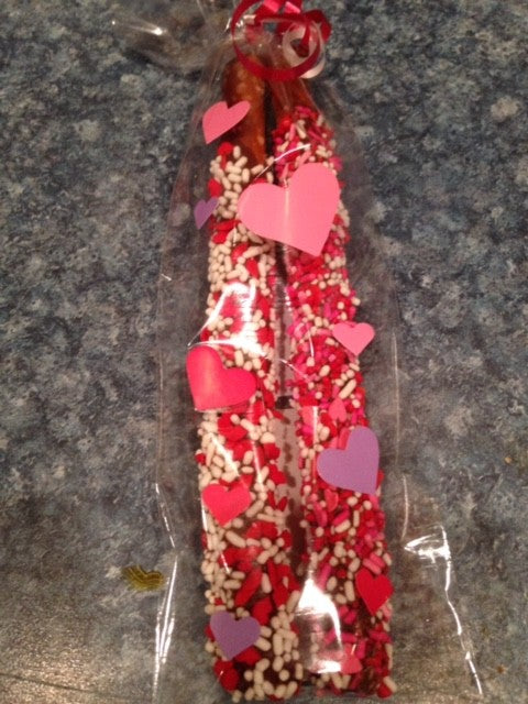 Crispy pretzel rods are dipped in fine chocolate and decorated with Valentine theme candy confetti and sprinkles. One dozen pretzels, packaged two per bag (for a total of 6 bags), gift boxed and ready to give. This makes a perfect gift for family, friends, and co-workers, or will simply satisfy your sweet and salty tooth! NOTE: Item does not contain peanuts, however some ingredients may have been manufactured in a plant which processes peanuts.