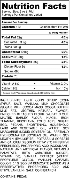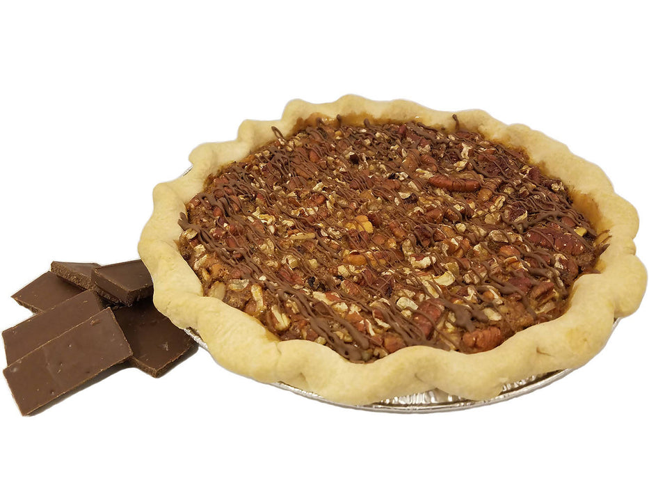 The same classic recipe as our original Texas Pecan Pie with delicious chocolate chunks added inside and a chocolate drizzle on top. We start with a hand made crust, roll it out, and pinch the edges by hand to make our signature crust design. Savor the flavor of this Chocolate Pecan Pie when warmed and served with a side of vanilla ice cream.  9inch deep dish