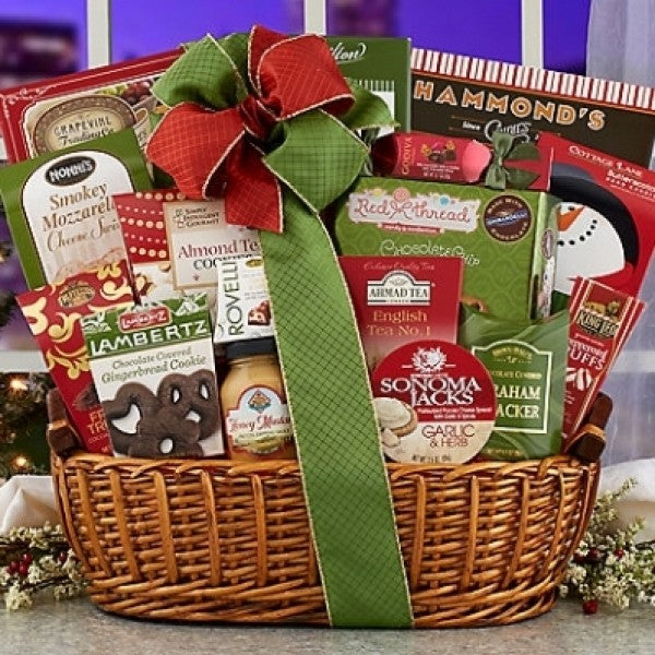 Tis the season to indulge-and there is nothing better than a basket of holiday delights. This basket is filled with Godiva milk chocolate truffles, mozzarella cheese swirls, sea salt olive oil crackers, garlic herb cheese spread, chocolate chip cookies, Truffettes truffles, chocolate covered gingerbread cookie, English tea, peppermint candy, Brown & Haley chocolate graham cracker, butterscotch, Bavarian pretzels and Napa Valley Mustard Company honey mustard dipping sauce, peanut brittle, almond tea cookies and Italian milk chocolate pralines. Gift Size: 18"" x 11"" x 10"" It includes: